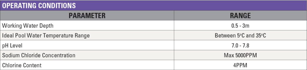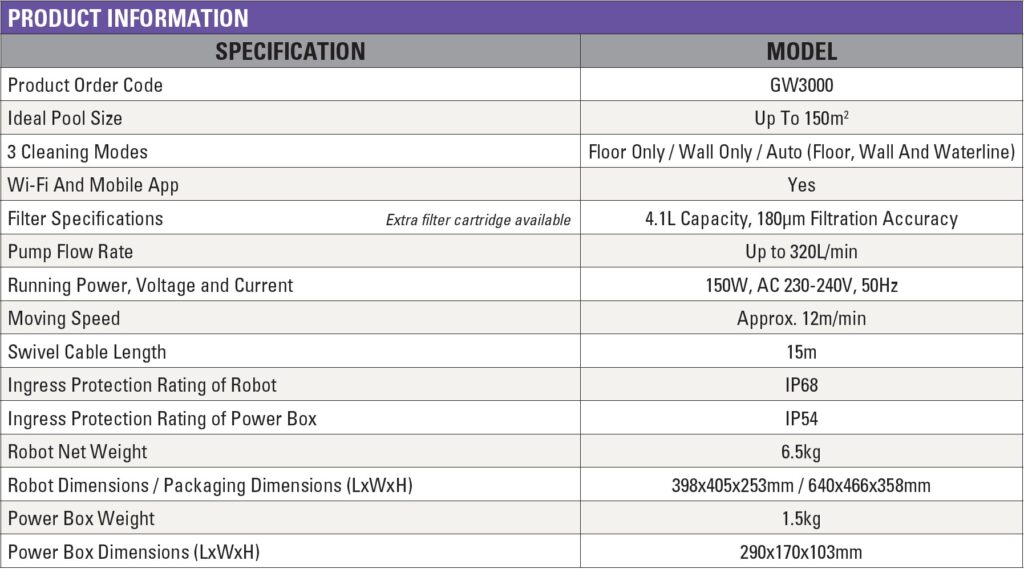 • Warranty: 3 year warranty on main body, PCBA, power supply and adapter, floating cable, power cord and indicator light | 2 year warranty on drive motor and pump motor | 12 months on consumable parts – filter basket, track and roller brush.