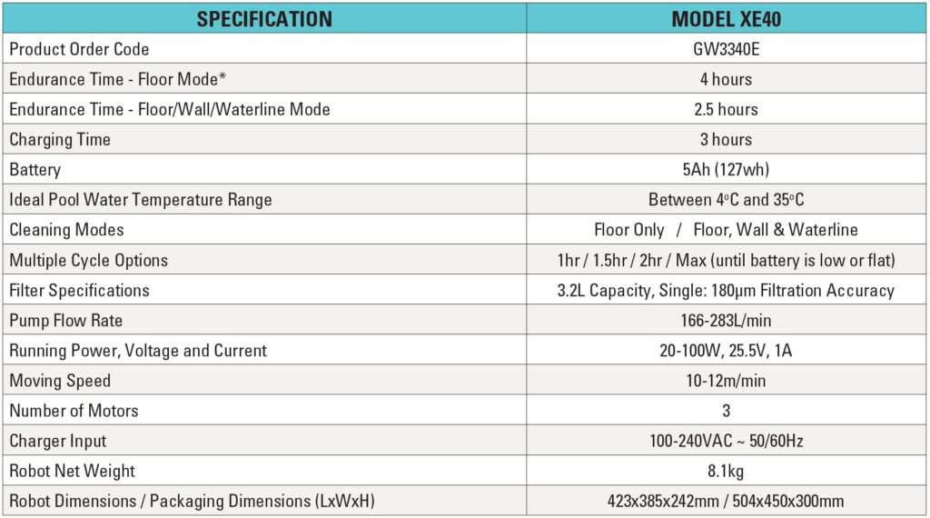 The InverX Eco XE40 is capable of running up to 4 hours* on a single charge, based on Floor Mode only. For Floor/Wall/Waterline Mode, it can last up to 2.5 hours on a single charge.